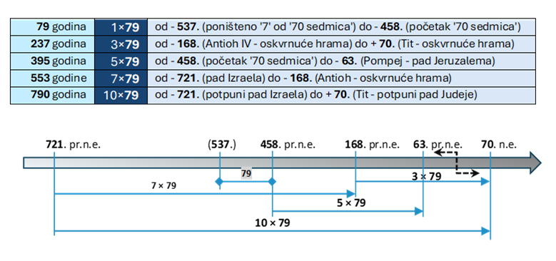 Kodni broj '79' - Odgađanje Mesijinog dolaska je vezan uz kodni broj 79 koji je prisutan u tom istom vremenskom razdoblju određenih za prvih '7 sedmica' [79 + (7×7) + 79]. Taj broj unutar 'zrcalne simetrije' i 'prirodnog niza' nije odredio samo vrijeme odgađanja Mesijinog dolaska nego je bio korišten i za određivanje drugih važnih događanja vezanih uz Izrael i Mesiju što je vidljivo na slijedećoj vremenskoj crti.
