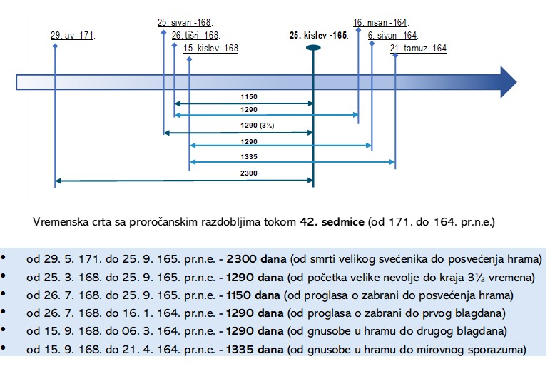 Proročanska razdoblja - Iako je bilo uzbudljivo istraživati sva Danijelova proročanstva, ne možete ni zamisliti što se sve odvijalo tokom ovog istraživanja i kako sam se osjećao dok sam dobivao uvid i postepeno otkrivao događaje vezane uz proročanska razdoblja koja su iznosila '2300 večeri i jutara', te razdoblja od 'tri i pol vremena', '1290 dana' i '1335 dana'. Do danas još nitko nije išao toliko daleko da otkrije točne datume povezane s tim razdobljima jer su istraživači na tom putu nailazili na prepreke koje nisu znali priječi te su odustajali, dok su drugi išli u špekulativno pretvaranje dana u godine i tako izašli iz okvira Božjeg plana. Ja nisam odustajao iako mi je bilo potrebno oko godinu dana da rekonstruiram sve događaje iz tog posebnog razdoblja Židovske povijesti koji su se odigravali u 42. sedmici (od 171. do 164. pr.n.e.). Jedan od razloga zašto nisam odustajao je osjećaj da me nešto vodi i daje mi uvid u ono što je do danas mnogima bilo sakriveno. Bilo je dovoljno odrediti datum za jedan važan događaj te su se svi drugi datumi postepeno otkrivali i uklapali na ovu vremensku crtu.