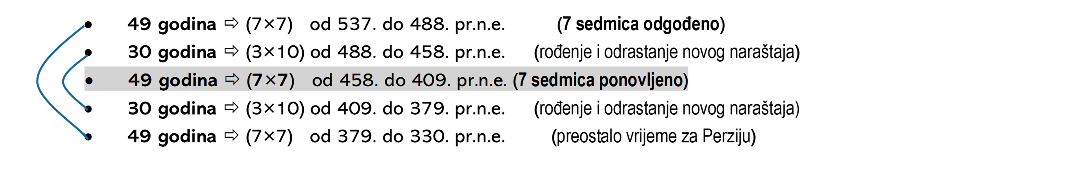 Ovaj primjer je značajan po tome što se prvih 7 od '70 sedmica' nalazi u sredini vremenske crte kao dokaz da je Bog do tada odgodio vrijeme početka tog proročanskog razdoblja za 79 (49+30) godina čime je odgodio i vrijeme dolaska Mesije što je vjerojatno utjecalo na posljednji naraštaj Židova koji više nisu znali kada će točno doći Mesija jer je on morao doći još u vrijeme Julija Cezara. U Bibliji se nalazi razlog zašto tada nije došao, a to će i za vas biti jedno od važnih otkrića koji se kriju u ovoj knjizi.