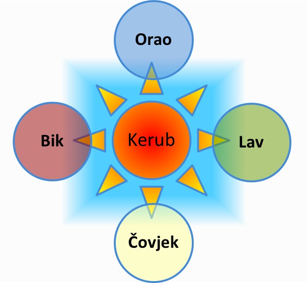 - bića sa različitim brojem krila koja stoje oko tih prijestolja (serafi, kerubi)