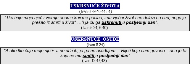 "jer dolazi čas u koji će svi koji su u grobovima čuti glas njegov i izaći - oni koji su činili dobro na uskrsnuće života, a oni koji su činili zlo na uskrsnuće osude." (Iv 5:28,29)