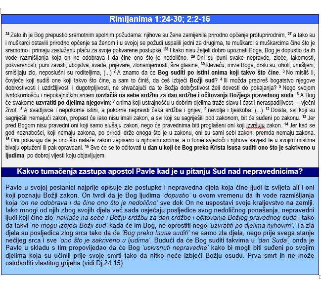 "… svakome uzvratiti po djelima njegovim: onima koji ustrajnošću u dobrim djelima traže slavu i čast i neraspadljivost- vječni život. A svadljivce i nepokorne istini, a pokorne nepravdi čeka srdžba i gnjev, nevolja i tjeskoba. To čeka svakog čovjeka koji čini zlo (…). A slava i čast i mir čeka svakoga tko čini dobro." (Ri 2:6-10)